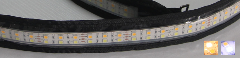 Our camping strip light is brighter and stronger. Input voltage is 12V, with 144 pcs LEDs 1400LM output. It has cigarette plug and 5 meter extension lead. Velcro tape and detachable hooks enable you to position the light at liberty. Sports carrybag store the light and wire neatly. Smart switch can be used either for dimming or for color changing.