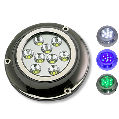 - Surface-mount LED underwater lights include three series 9W ,18W and 27W. Different light colors available for each series. All lights use marine grade SS316 housing. They can work in most salty ocean water. The light can be installed to boat hull surface by 3 M4 bolts. Input voltage range is 10-30V. Flood light model's emitting angle is 160° while beam light angle is 30°. Installed 30-50cm below water line. All models have built-in constant current driver.