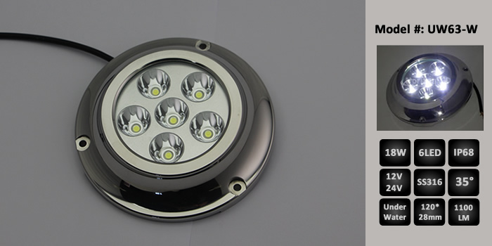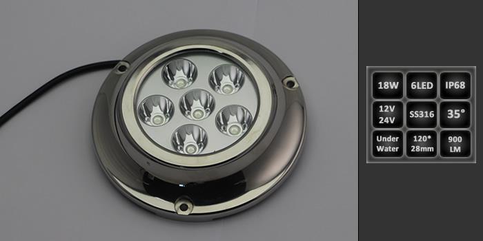 18W surface mount underwater light. To be installed on small or middle size yacht / boat / marine. Beam light in cool white / blue / green. It is very simple to install it to the boat hull. No need to open big hole on the hull. SS316 housing and 5mm toughed glass, and streamline shape, make the light no afraid of corrosion and strike.IP68, installed 20-50cm below waterline. Newly upgraded 18W underwater light, has built-in constant current driver. No need extra driver to work well under 10-30V. Its inner thermal IC will turn off the light temporaily if light get too hot. In this way, the lamp won't be damaged if user forget to turn off the light while it is out of water.