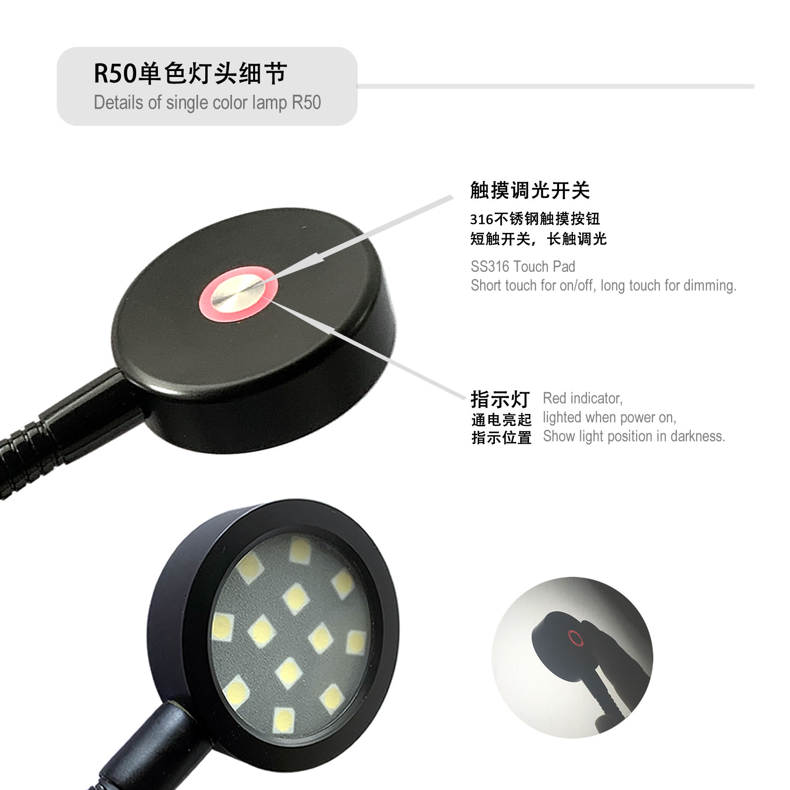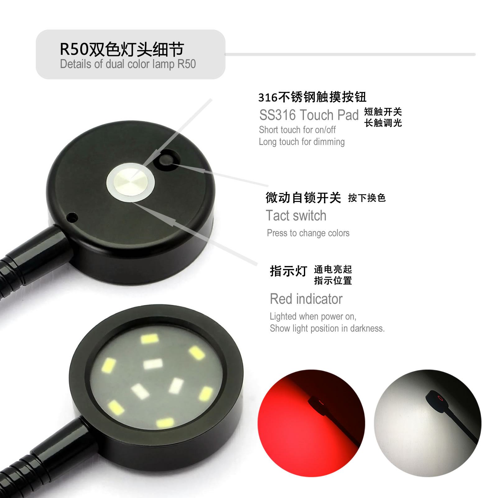 This gooseneck light can be used as chart light, map light, reading light for boat, car or house lighting. It can work under wide range input voltage, no worry about voltage floating. Its switch and all electric parts are integerated and sealed in the lamp head. A red indicator show the light position in darkness. It uses touch sensor swtich, and distinguish different operation mode by long touch or short touch. The dual color models can offer red and white which are perfect for illuminating cabin in dark, because people can still see outside vision while lighting red light in the cabin. Different foots are available for vertical / horizontal installation.