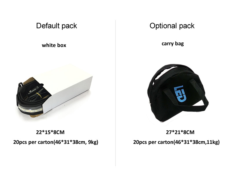 Item type: Strip Lights Power(W): 15W Beam Angle(°): 160° Application: Camping lighting Input Voltage: 12V Product size: L1350* W53*D10mm Installation: By hooks or Velcro IP Rating: IP67 Body Material: PVC & textile Unit pack weight: 0.45KG Port: Cigarette plug Power Cord: