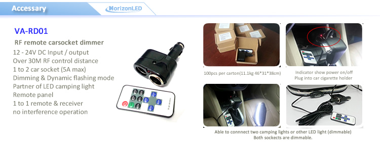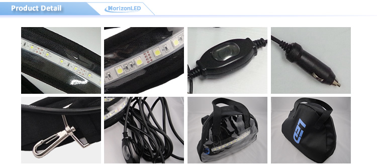 Item type: Strip Lights Power(W): 20W Beam Angle(°): 160° Application: Camping lighting Input Voltage: 12V Product size: L2150* W53*D12mm Installation: By hooks or Velcro IP Rating: IP67 Body Material: PVC & textile Unit pack weight: 0.5KG Port: Cigarette plug Power Cord: